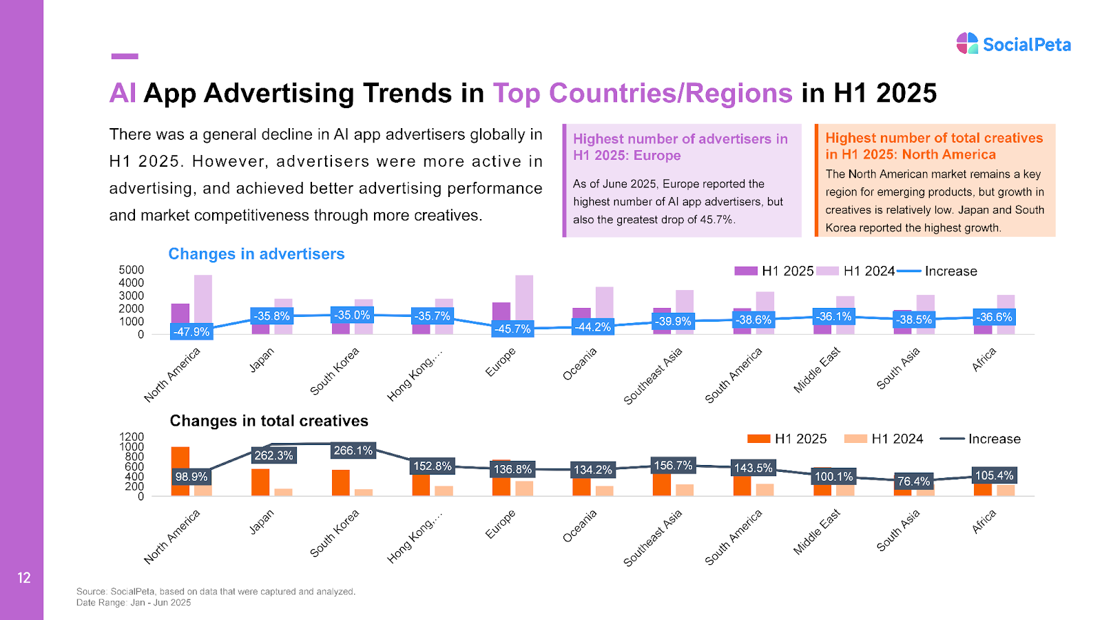 • Japan and South Korea stood out with creative volumes surging 262.3% and 266.1% Y/Y, respectively, positioning them as high-potential growth markets.