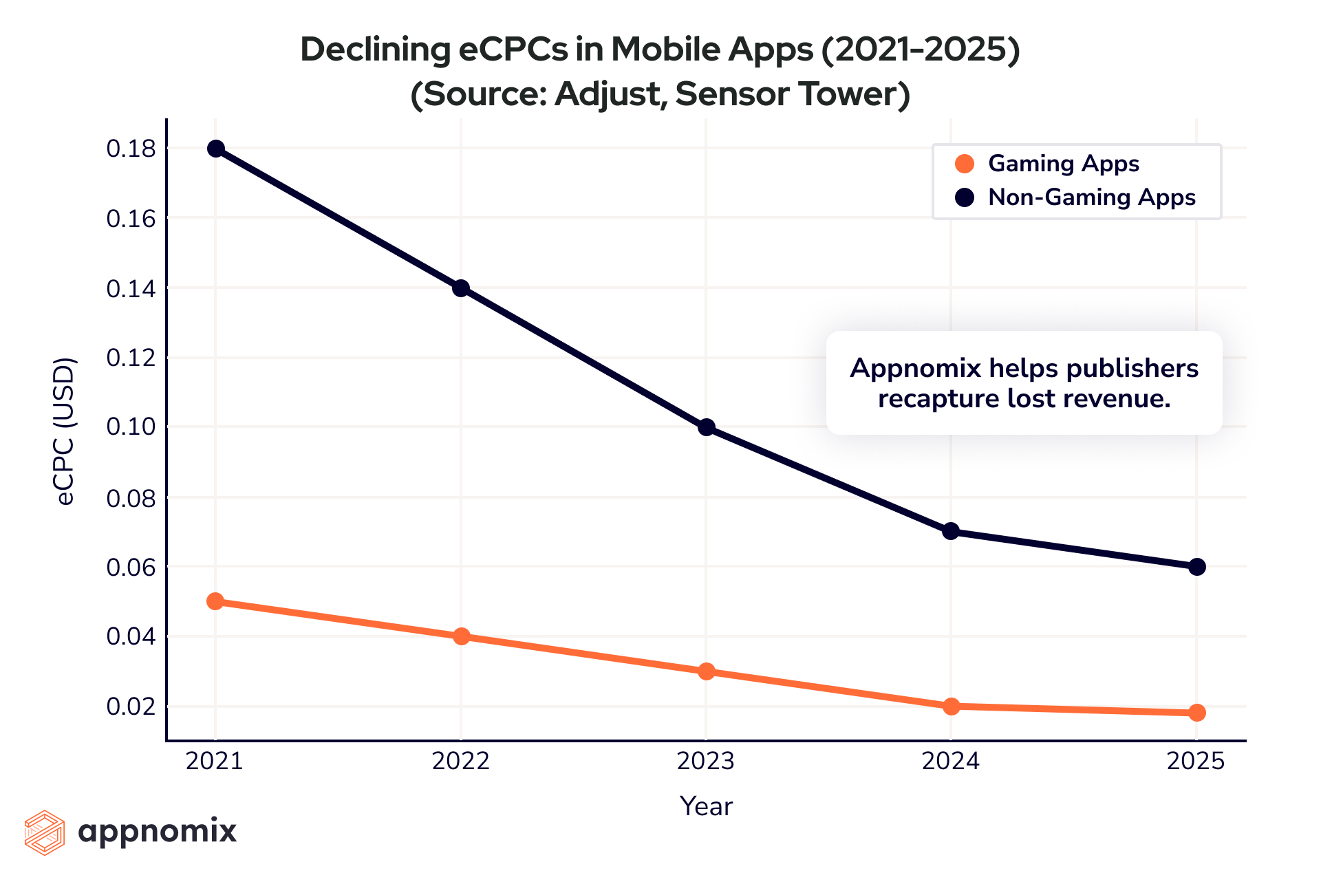 The decline is clear in the latest benchmarks: Adjust reports that the global median eCPC fell from $0.04 in 2023 to $0.03 in the first half of 2024, a 25% drop. This mirrors the steady downward trend shown in the chart, underscoring how ad revenue has become a shrinking piece of the monetization mix.